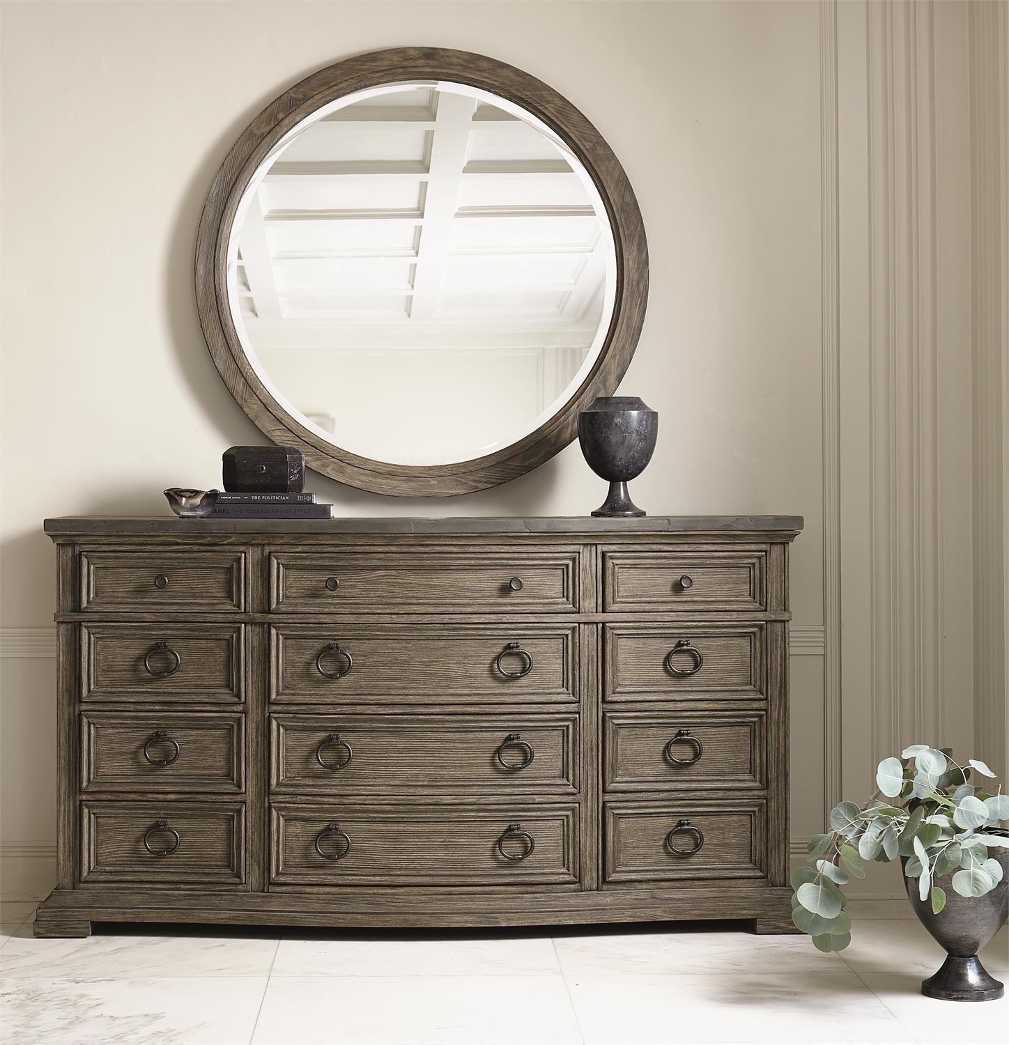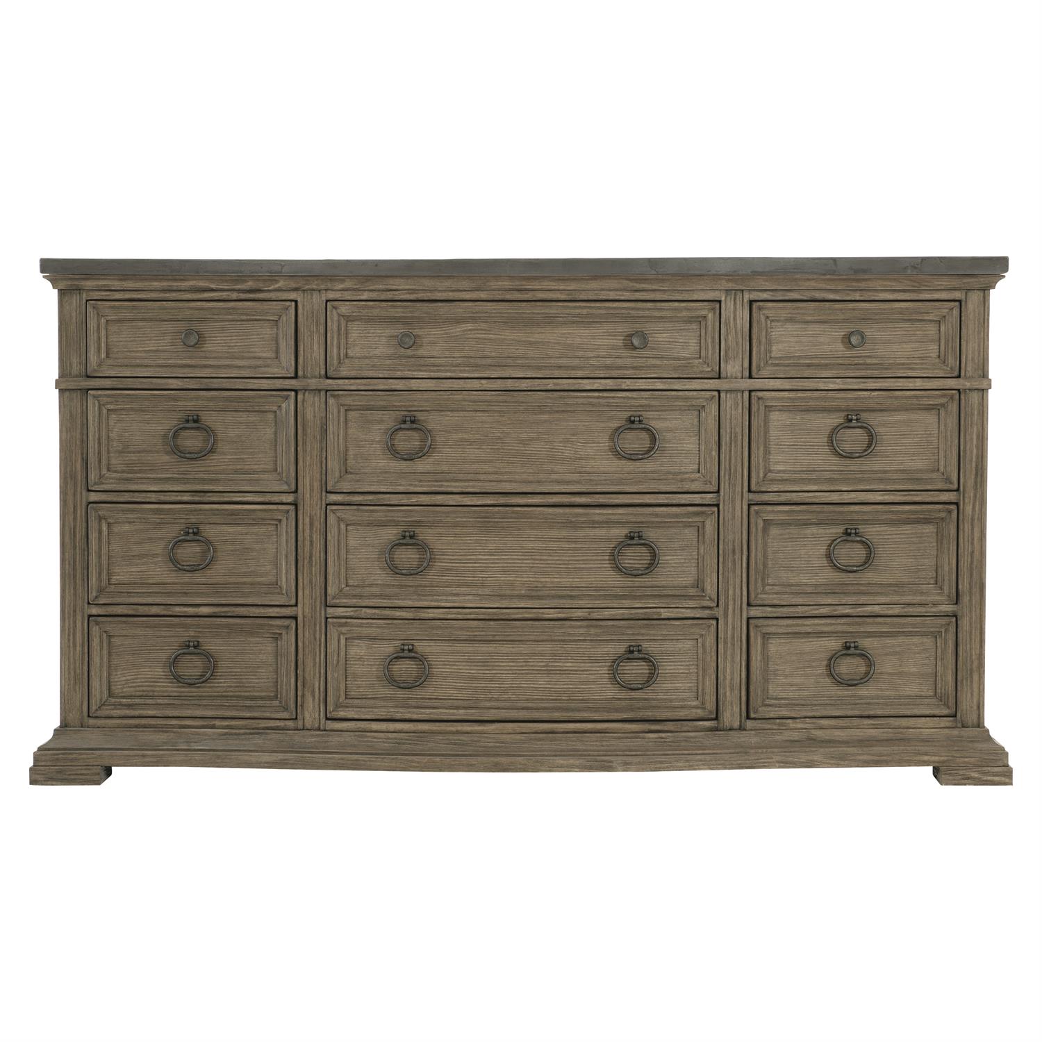 This stunning collection blends a casual style with a touch of formality, incorporating a mix of unexpected materials and natural textures. An outstanding ensemble of nightstands, chests and dressers provides a multitude of choices for creating a bedroom with a relaxed yet sophisticated feel. This commodious twelve-drawer wire-brushed pine dresser features a slightly bowed front, charming metal pulls and appealing lines. It is topped with a shapely cast concrete top in a basalt finish for a subtle rugged look. Shaped cast concrete top in Basalt finish Radiata pine solids with quartered yellow pine veneers Wire-brushed in Desert Taupe finish Twelve drawers Adjustable glides Anti-tip kit Dimensions: W: 69.25 in D: 21.38 in H: 36.94 in