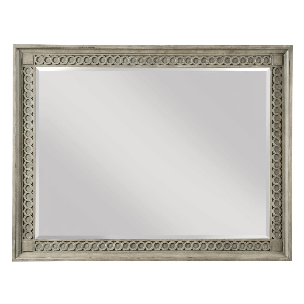 Guilloche molding on regent mirror with bevel and mirror supports for easy setup.
