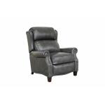 Classic smaller scale wing back lounge chair recliner. 3-way push thru the arms mechanism with footrest extension. Kneed back rolled arms with copper finished nail head trim. Adjustable semi attached pub back, boxed loose seat cushion with pocketed coils and down blend feather wrap. Shaped lower side rails and footrest. Merlot finished tapered wood legs.