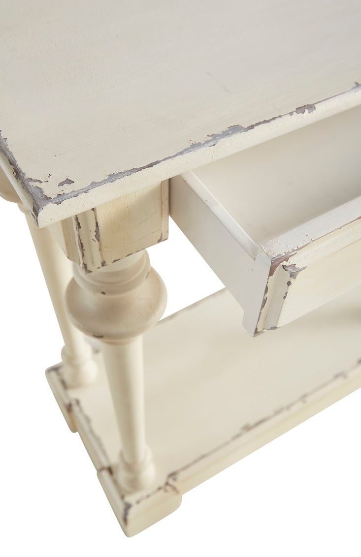 This simply charming console is scaled to fit in even a tight entry way, and is designed with a secret! There are two concealed drawers in the top, which rests upon stately turned legs and a blocked plinth base. The soft white finish is lightly distressed to give the appearance of age, and to soften the blows of every day life. Item Weight135