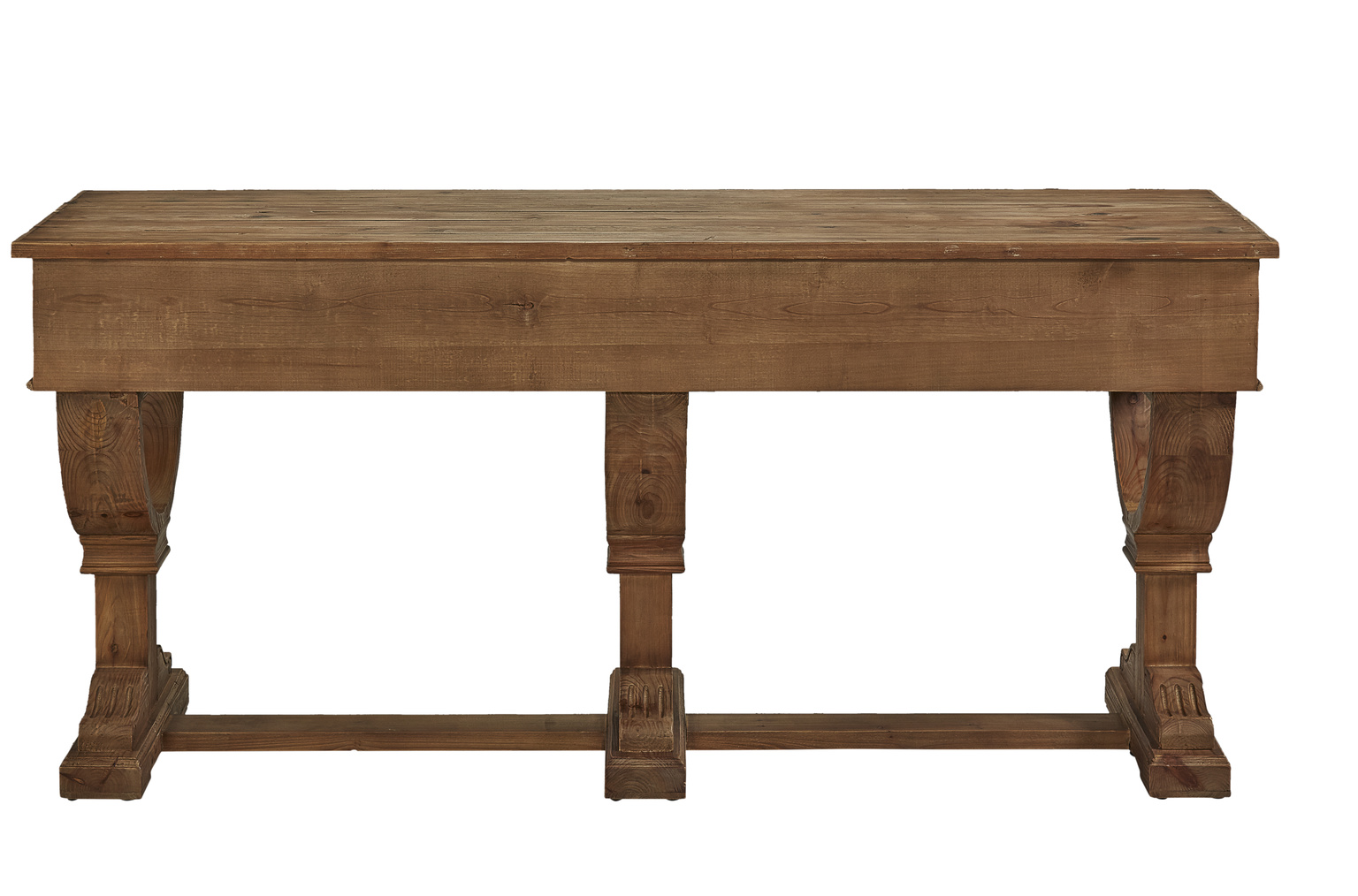 Finished on all sides, with two useful drawers, this handsome reclaimed pine console can be used against the wall or floating in a larger space. Item Weight121