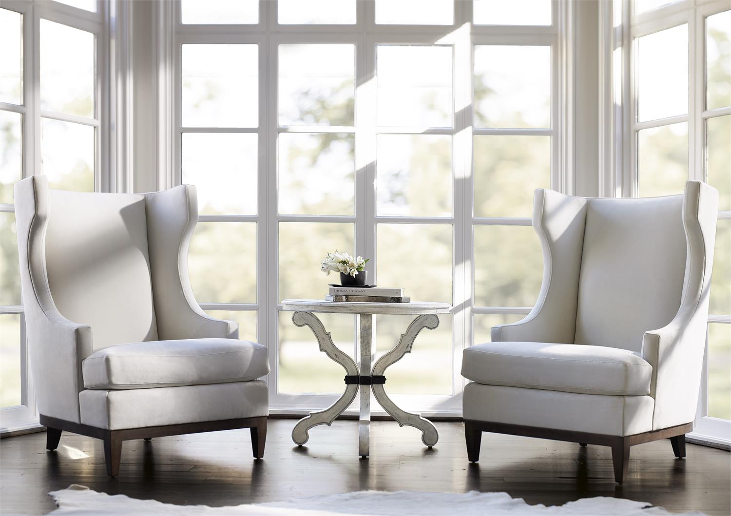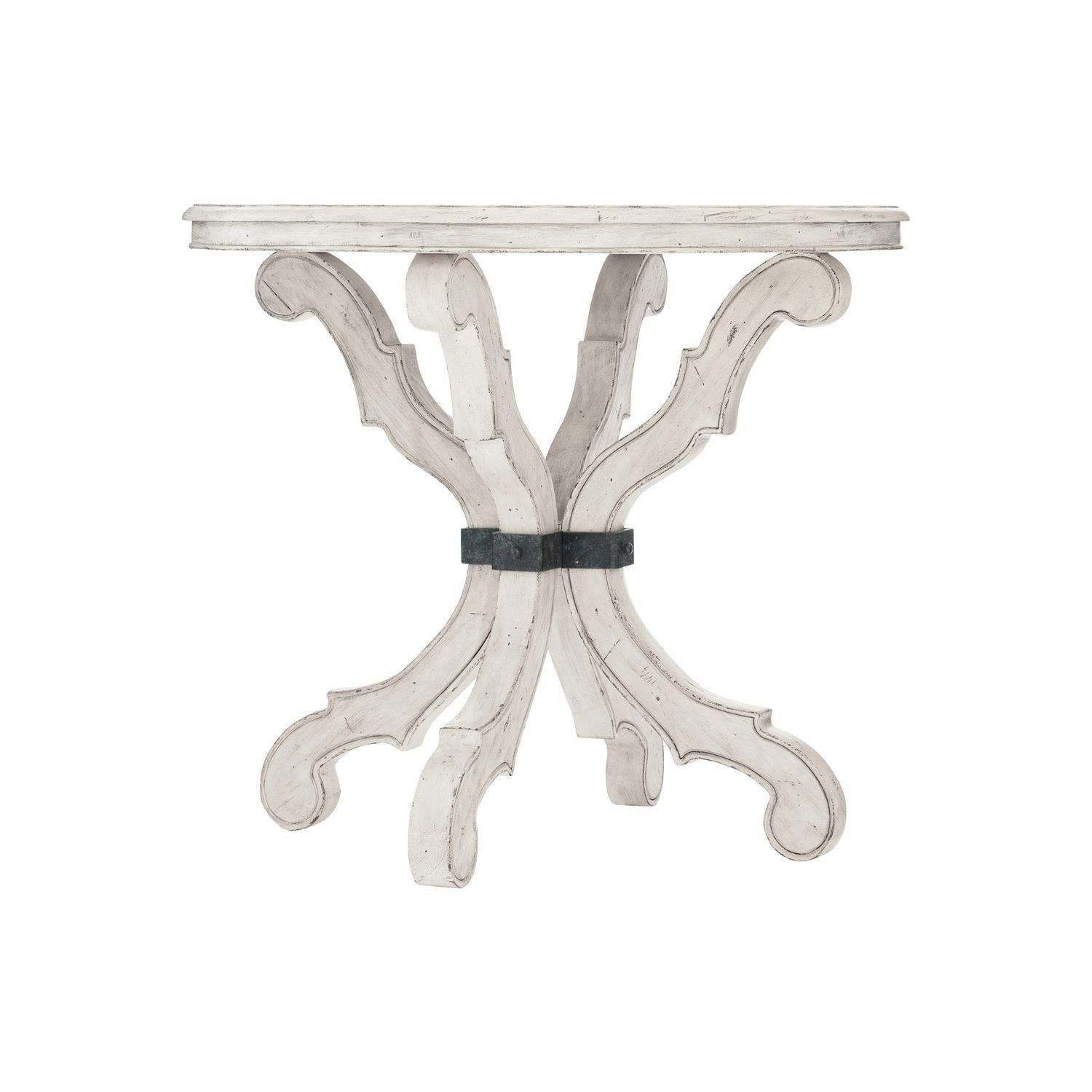 Inspired by French Provincial design, this round side table balances traditional flourishes with casual style. W: 30 in D: 30 in H: 26 in Dressy yet relaxed, the Mirabelle round side table has a warm feel and a hint of old-world charm. Elegant lines and a gently worn whitewashed Cotton finish combine for a casually sophisticated look. With a graceful flourish, the scrolled legs evoke 17th century French Provincial style, while a four-pronged metal collar in Carbon finish adds rustic appeal. Description • Cotton finish • Round top with base consisting of four shaped legs with center four-pronged metal collar • Adjustable glides • Specifications subject to change without notice