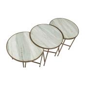 This round shaped bunching table can be paired with the coordinating round table to create numerous unique configurations. The Sibyl Coffee Table is finished in refined brushed brass with a marble top in feather green. Marble is a natural material. Differences in color and pattern should be expected and celebrated. Materials: Iron, Marble Finishes: Brushed Brass, Feather Green Marble Overall Dimensions: W20.375 x D20.375 x H20.25 This product uses natural materials. Differences in color and pattern should be expected.